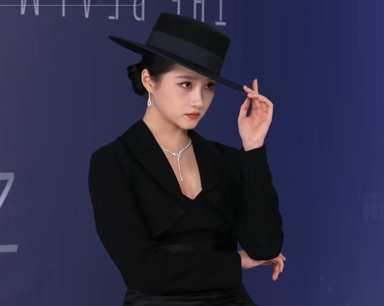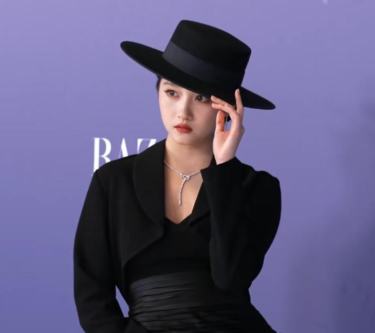 这顶礼帽堪称点睛之笔,既增加了造型的层次感,又巧妙修饰了比例。她摆造型时状态松弛,不再有以往的拘谨感,每一个姿态都优雅大方。