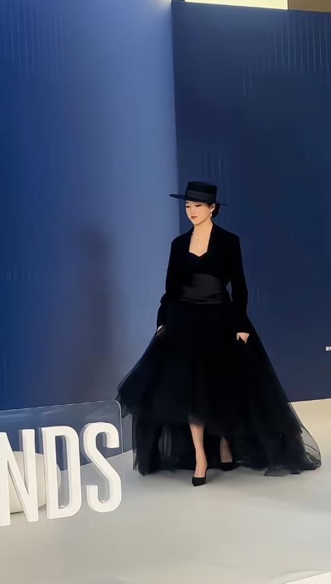 她选了一身黑色无袖礼服,极简设计却尽显巧思。抹胸处的镂空细节精致耐看,裙摆长度恰到好处,完美凸显优越身材比例。